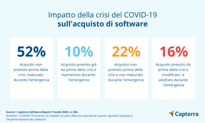 A seguito di questa esigenza gli analisti avevano domandato agli intervistati se la loro azienda avesse adottato nuovi software per poter far fronte a questa inaspettata esigenza. Il dato che era emerso dimostrava che il 60% delle società aveva acquistato nuovi software per aiutare i dipendenti a lavorare da casa, o aveva intenzione di acquistarli a breve.