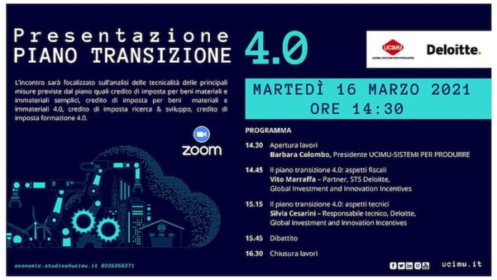 Si terrà martedì 16 marzo 2021 alle 14.30 sulla piattaforma online Zoom l’incontro di presentazione del Piano Transizione 4.0 organizzato da UCIMU-SISTEMI PER PRODURRE e DELOITTE. All’incontro, sarà focalizzato sull’analisi delle tecnicalità delle principali misure previste dal piano quali credito di imposta per beni materiali e immateriali semplici, credito di imposta per beni materiali e immateriali 4.0, credito di imposta ricerca & sviluppo, credito di imposta formazione 4.0.